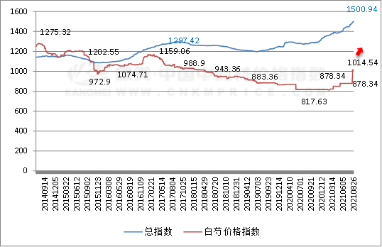 2、指數(shù)走勢(shì)2021年8月26日白芍價(jià)格指數(shù)值為1014.54點(diǎn),低于此時(shí)總指數(shù)的1500.94點(diǎn)。從2014年7月6日至2021年8月26日白芍價(jià)格指數(shù)與總指數(shù)的歷史走勢(shì)來(lái)看,白芍價(jià)格指數(shù)與總指數(shù)出現(xiàn)兩次交叉,近5年一直往底部調(diào)整,產(chǎn)新期出現(xiàn)快速上升。