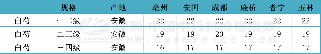 近期各市場(chǎng)白芍產(chǎn)品報(bào)價(jià)統(tǒng)計(jì)(單位:元/千克)