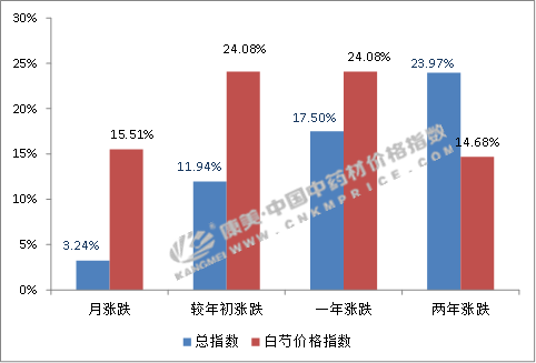 白芍價(jià)格指數(shù)與總指數(shù)漲跌對(duì)比