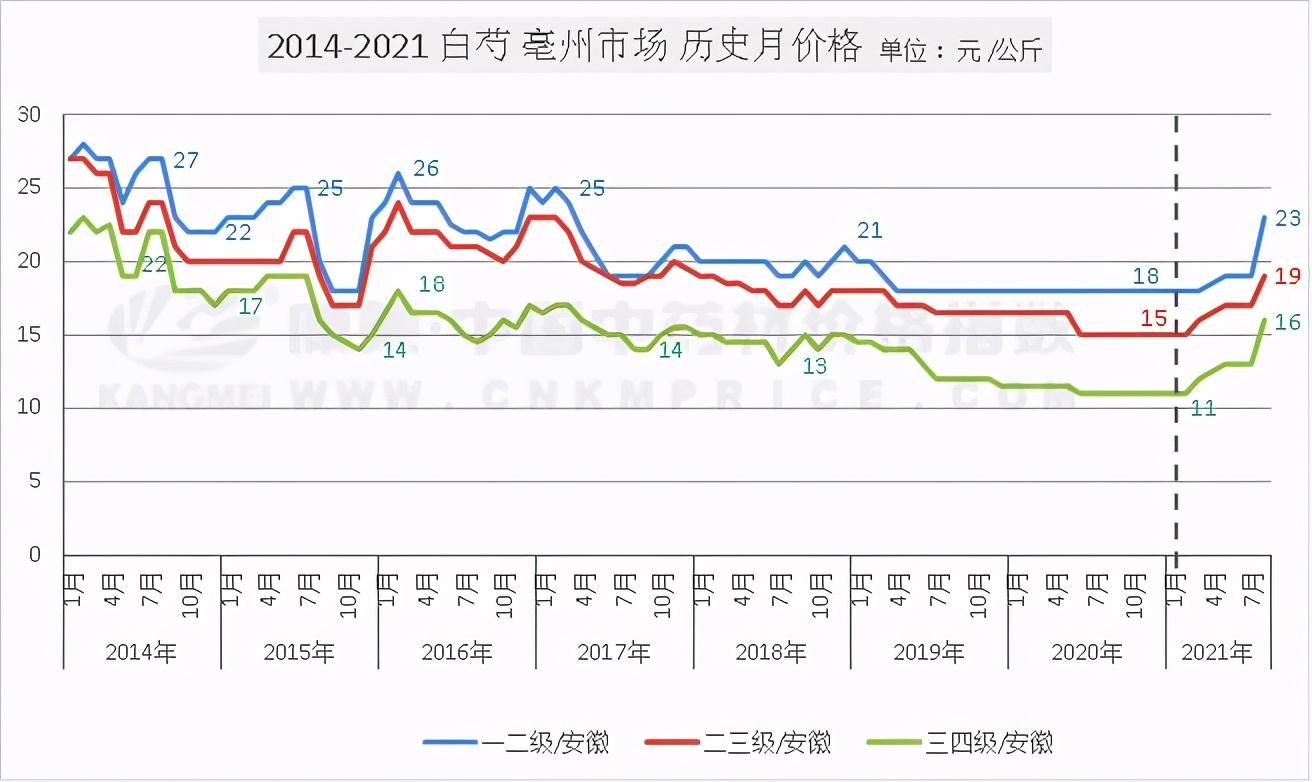 與前年同期(2019年8月26日)相比,上漲了14.68%,比上年同期(2020年8月26日)上漲了24.08%。同期,總指數(shù)分別上漲23.97%,上漲17.50%。白芍價(jià)格指數(shù)8月漲幅大于總指數(shù)達(dá)到15%,貢獻(xiàn)了今年60%的漲幅。