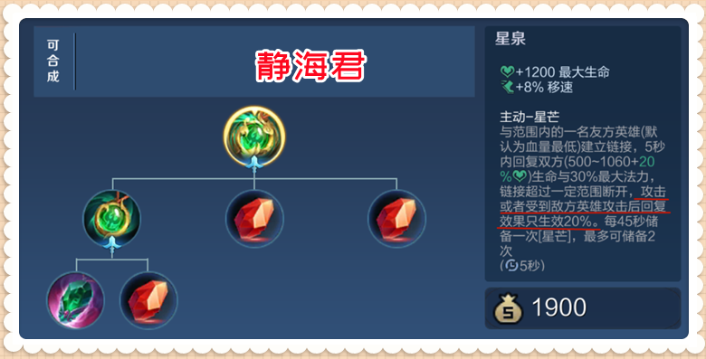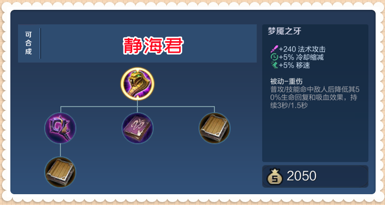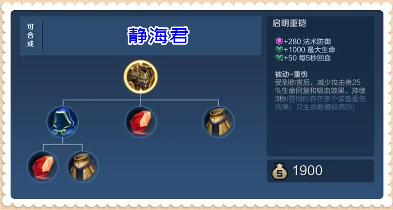 +280 法術(shù)防御+1000 大生命值+50 每5秒回血重傷:在受到傷害后,啟明重鎧的使用者可以減少攻擊者25%生命回復(fù)和吸血果,持續(xù)3秒(如果多件重傷裝備同時生,只生數(shù)值較高的那個)。從基礎(chǔ)屬性可以看到,啟明重鎧是一件法術(shù)防御裝,它的法抗屬性比不死鳥之眼高,比魔女斗篷和永夜守護低。另外,雖然還有大生命值和回血果,但啟明重鎧并沒有其它的防御或者生存方面的提升,在這一點上,不管是魔女斗篷、永夜守護還是不死鳥之眼的果都比啟明重鎧好的多。