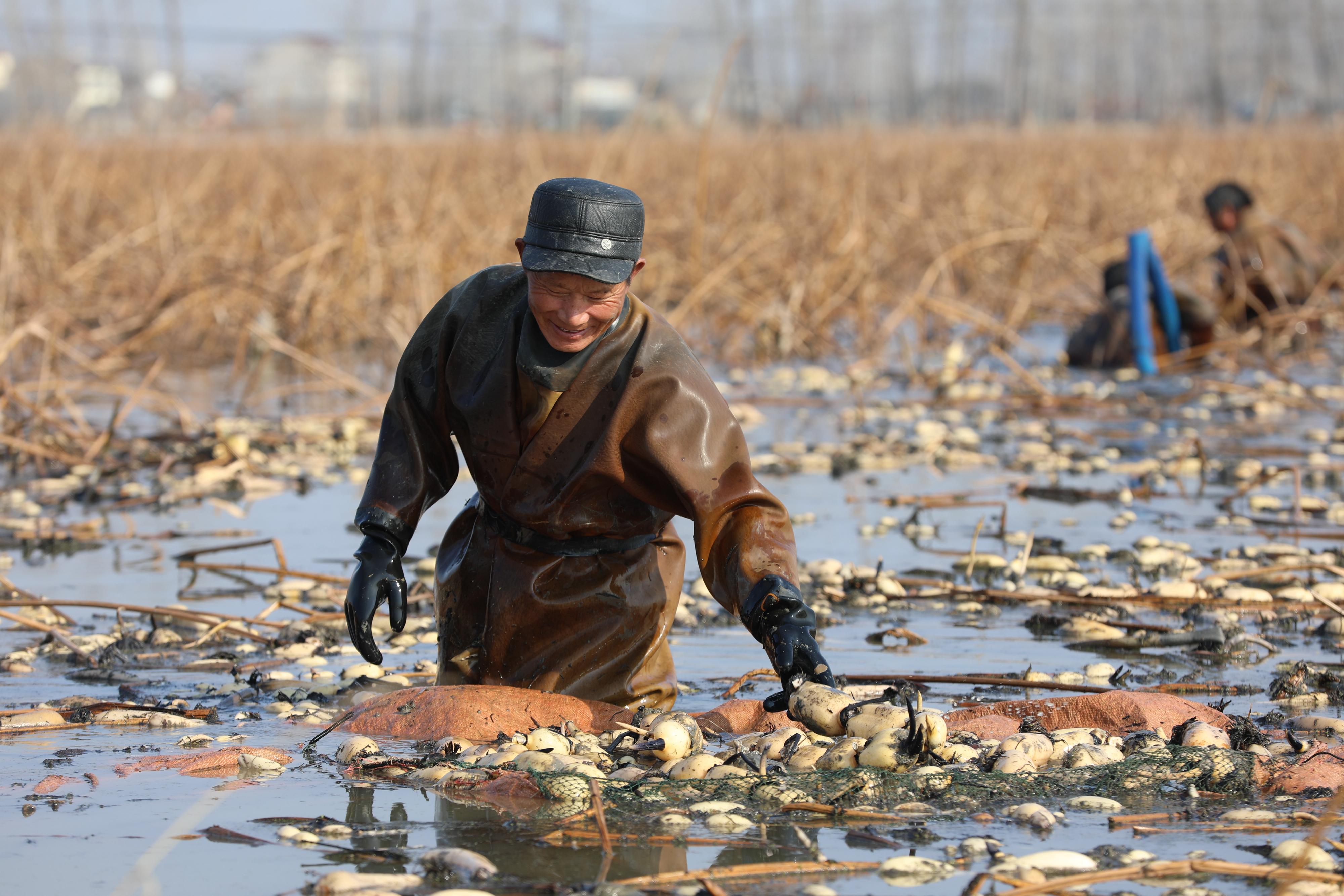 1月3日,在江蘇省淮安市洪澤區(qū)朱壩街道,農(nóng)民在采挖蓮藕。 新華社發(fā)(萬震 攝)