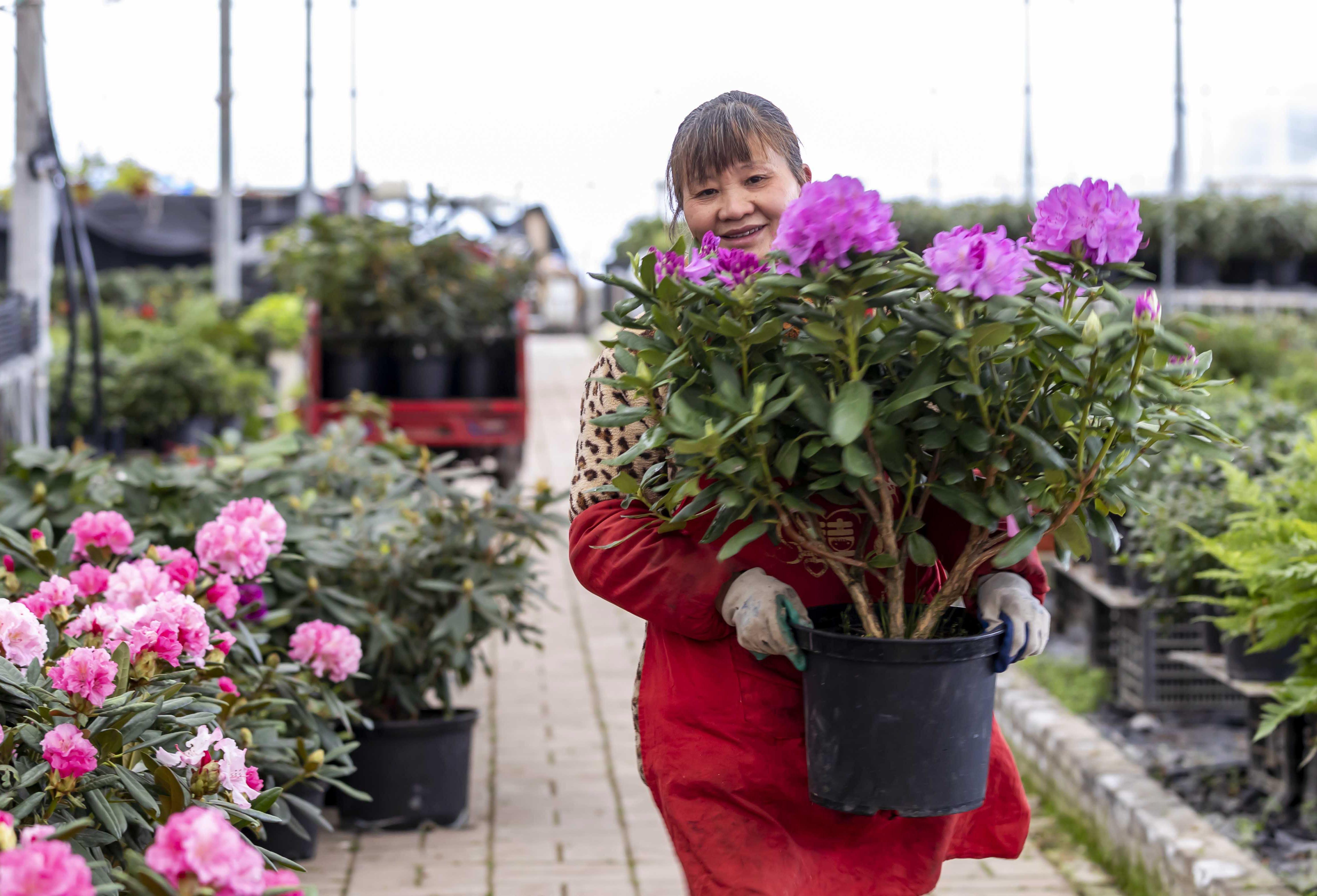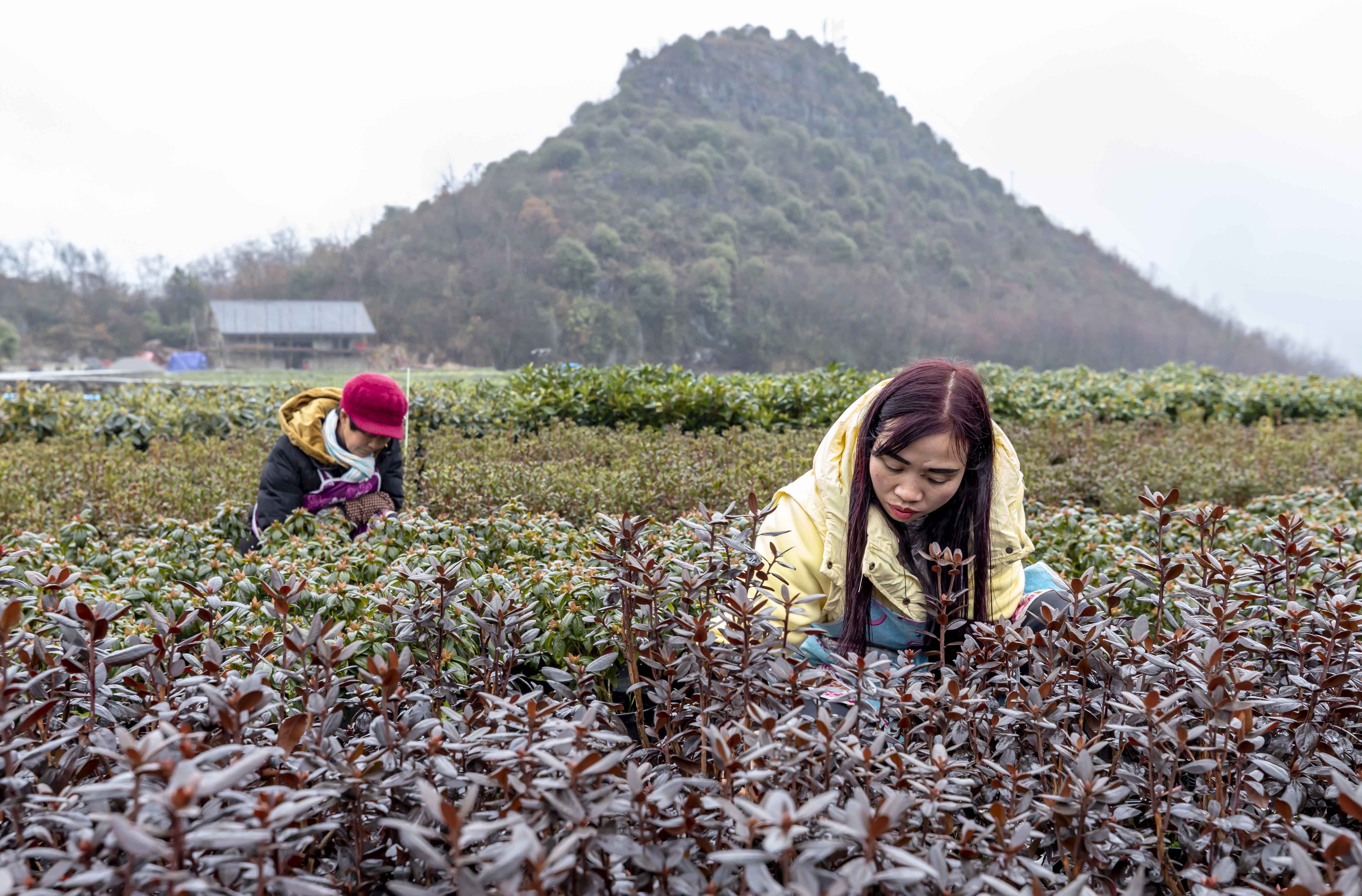 1月3日,村民在貴州省畢節(jié)市百里杜鵑管理區(qū)匯境花卉科技園管護花卉。 新華社發(fā)(范暉 攝)
