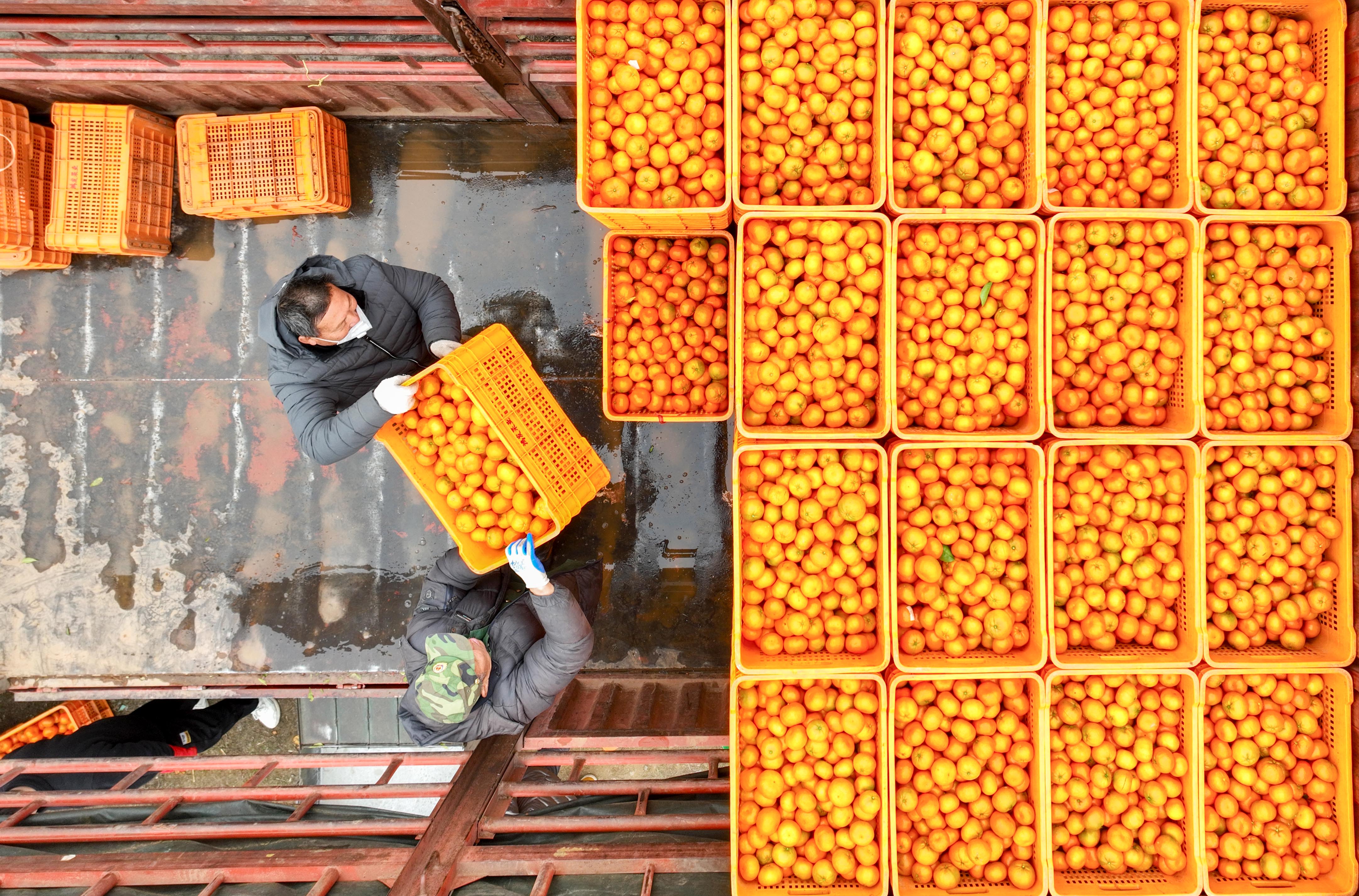 1月3日,在湖南省永州市道縣清塘鎮(zhèn)尹家村真秀農(nóng)業(yè)果園基地,農(nóng)民在裝運柑橘(無人機照片)。 新華社發(fā)(蔣克青 攝)