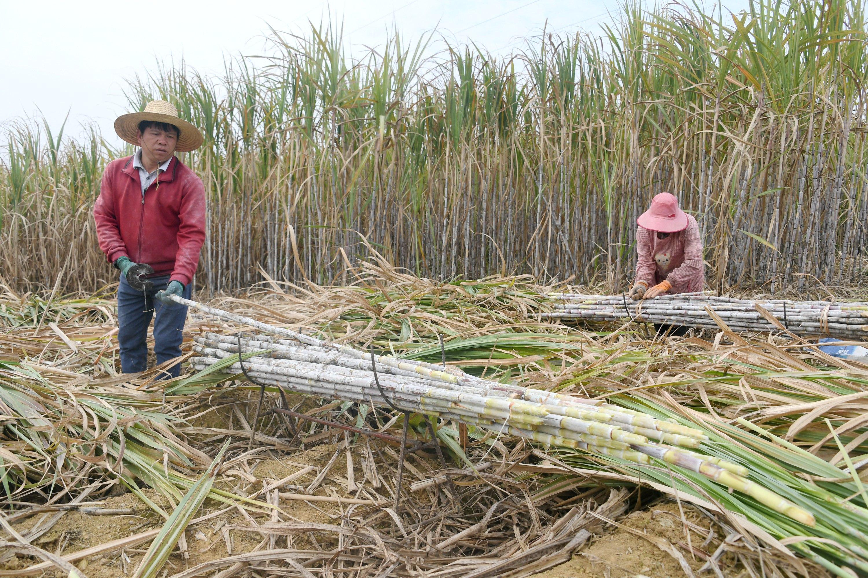 1月2日,在廣西河池市羅城仫佬族自治縣小長安鎮(zhèn)守善村,農(nóng)民在甘蔗地里砍收甘蔗。 新華社發(fā)(廖光福 攝)