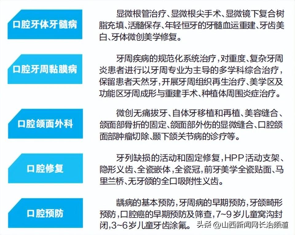 口腔科開展項目有:顯微根管調(diào)節(jié)、根尖手術(shù),顯微鏡下復(fù)合樹脂充填,年輕恒牙的牙髓血運(yùn)重建,重度、復(fù)雜牙周炎患者進(jìn)行以牙周專業(yè)為主導(dǎo)的多學(xué)科綜合調(diào)節(jié),美學(xué)區(qū)及功能區(qū)牙周成形與重建手術(shù)、兒童口腔早期顏面管理、咬合誘導(dǎo),正畸牙周聯(lián)合調(diào)節(jié)牙周病,微創(chuàng)拔牙、自體牙移植和再植,HPP活動支架,無牙頜的全口吸附性義齒,種植導(dǎo)板引導(dǎo)下的種植,onlay植骨,上頜竇內(nèi)外提升,引導(dǎo)骨再生技術(shù)。