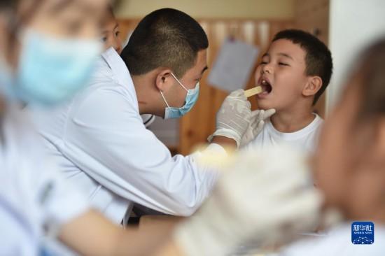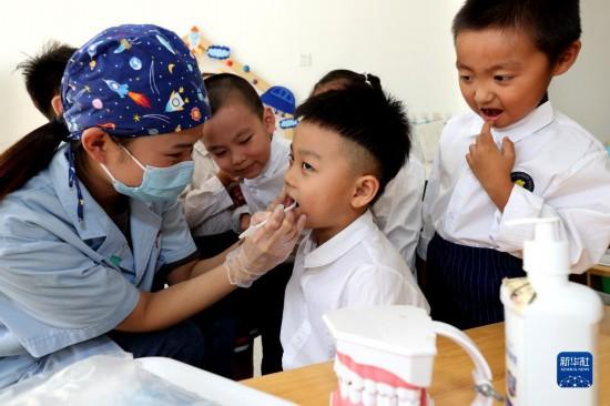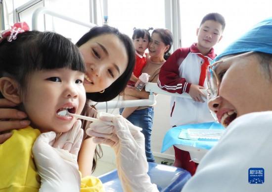 9月19日,河北省石家莊市井陘縣醫(yī)院口腔科醫(yī)生為小朋友進行牙齒檢查。