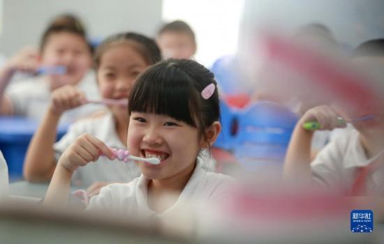 9月19日,浙江省湖州市德清縣東風小學學生學習正確的刷牙方法。