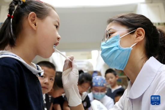 9月19日,在山東省棗莊市薛城區(qū)興安花園幼兒園,醫(yī)護人員在為小朋友檢查口腔健康狀況。