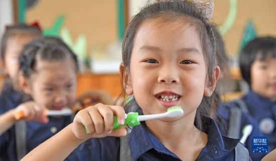 9月19日,浙江省臺州市仙居縣迎暉幼兒園的小朋友在學習正確的刷牙方法。