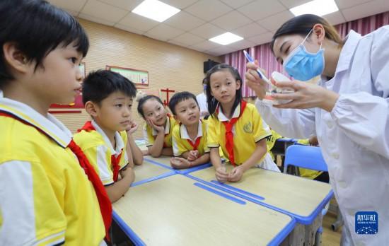 9月19日,在江蘇省連云港市核電鐘聲國際幼兒園,醫(yī)務人員給小朋友們檢查牙齒健康狀況。