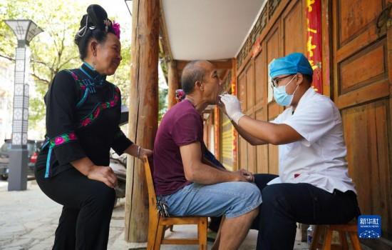 9月19日,村醫(yī)張震在貴州省黔東南苗族侗族自治州丹寨縣排調鎮(zhèn)排調村為村民檢查牙齒。