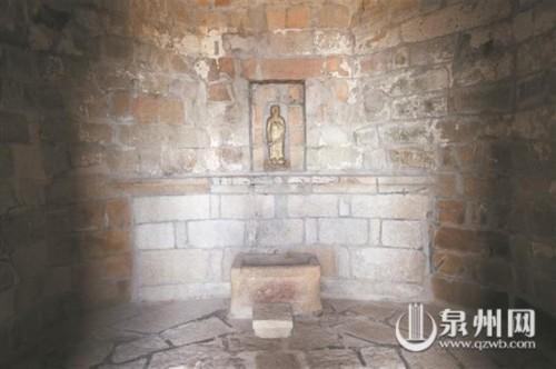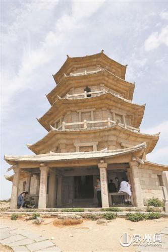 記者從山門(mén)遙望頂峰,只見(jiàn)一座石塔巍然矗立仿佛直入云霄,幾段石階開(kāi)鑿于山巖之間,兩側(cè)皆是巖石,頗為陡峭。待攀上山頂,極目遠(yuǎn)眺,便可見(jiàn)遠(yuǎn)處的海灣波光粼粼,四周景色盡收眼底,一覽無(wú)余?;赝f(wàn)壽塔,石塔整體宛若閣樓,由花崗巖筑成,共五層,呈八邊形。一層石門(mén)洞開(kāi),兩側(cè)石柱鐫刻有“勝地有緣方可進(jìn) 名山無(wú)福不能游”的對(duì)聯(lián),橫匾即 “泉南勝地”四字。門(mén)外還立有幾方石碑,記錄著萬(wàn)壽塔的歷史。《泉州府志》有載:“關(guān)鎖水口鎮(zhèn)塔也,高出云表,登之可望商舶來(lái)往?!笨梢?jiàn)萬(wàn)壽塔自古便是重要航標(biāo),亦被稱(chēng)為關(guān)鎖塔。走進(jìn)塔內(nèi),立即感到一陣清涼舒爽,原來(lái)萬(wàn)壽塔內(nèi)部呈空心樓閣狀,內(nèi)外溫差頗大,是天然的避暑勝地。