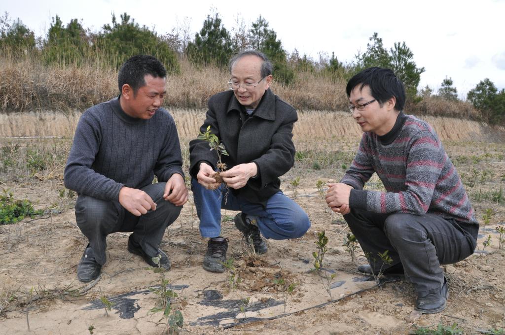 中國農(nóng)業(yè)科學(xué)院茶葉研究所原副所長白堃元(中)在四川廣元與當(dāng)?shù)夭柁r(nóng)交流茶葉種植技術(shù)(2015年3月27日攝)。新華社發(fā)