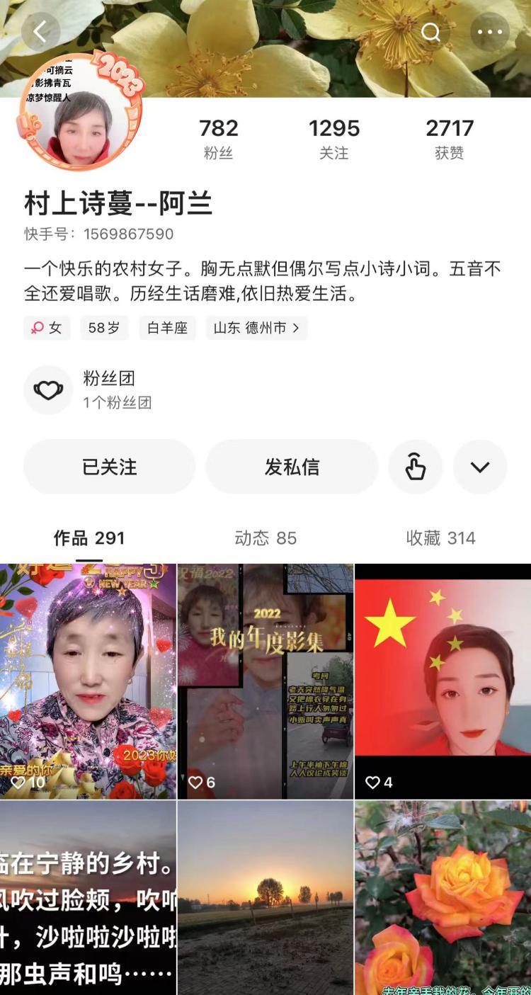 在“村上詩(shī)蔓--阿蘭”的主頁(yè)上可以看到,這位普通得不能再普通的“全職”菜農(nóng),愛穿花棉襖、愛自拍,偶爾吐槽老伴……已是知天命的年紀(jì)也依舊勞作,為生計(jì)奔波在賣菜路上。用她自己的話說,就是“胸?zé)o點(diǎn)墨但偶爾寫點(diǎn)小詩(shī)小詞,五音不全還愛唱歌,歷經(jīng)生活磨難卻依然熱愛生活”。