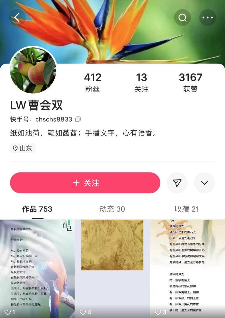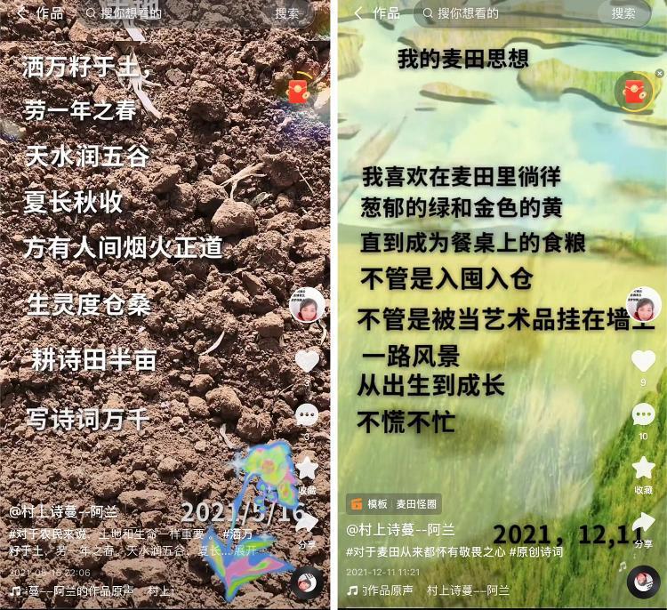 “村上詩(shī)蔓--阿蘭”在短視頻平臺(tái)上記錄勞作日常,分享田間野花、鄉(xiāng)村風(fēng)景:清晨、黃昏,晴天、雨天,散落一地的花瓣,新發(fā)芽的豆莢,再配上自己的原創(chuàng)詩(shī)作。抖動(dòng)的畫面,樸素的場(chǎng)景,文字優(yōu)美得像土垅上鼓出的一叢小花,驚艷到挪不開眼睛。她說:耕詩(shī)田半畝,寫詩(shī)詞萬千。