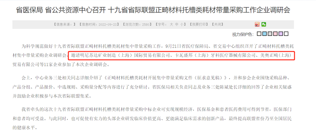 在《帶量采購公告》發(fā)布之前,陜西省曾開設(shè)帶量采購企業(yè)調(diào)研會,當(dāng)時并沒有涉及隱形正畸耗材[5]。
