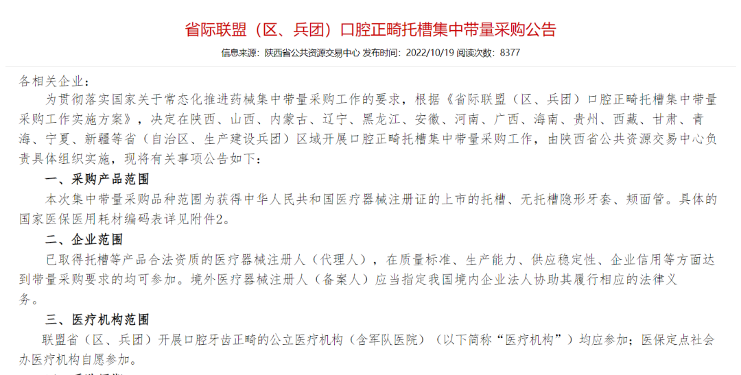10 月 19 日,陜西省公共資源交易中心發(fā)布《省際聯(lián)盟(區(qū)、兵團(tuán))口腔正畸托槽集中帶量采購公告》[1],決定由陜西省牽頭組織山西、內(nèi)蒙古、遼寧、黑龍江、安徽、河南、廣西、海南、貴州、西藏、甘肅、青海、寧夏、新疆等 15 ?。ㄗ灾螀^(qū)、生產(chǎn)建設(shè)兵團(tuán))開展口腔正畸托槽集中帶量采購工作。