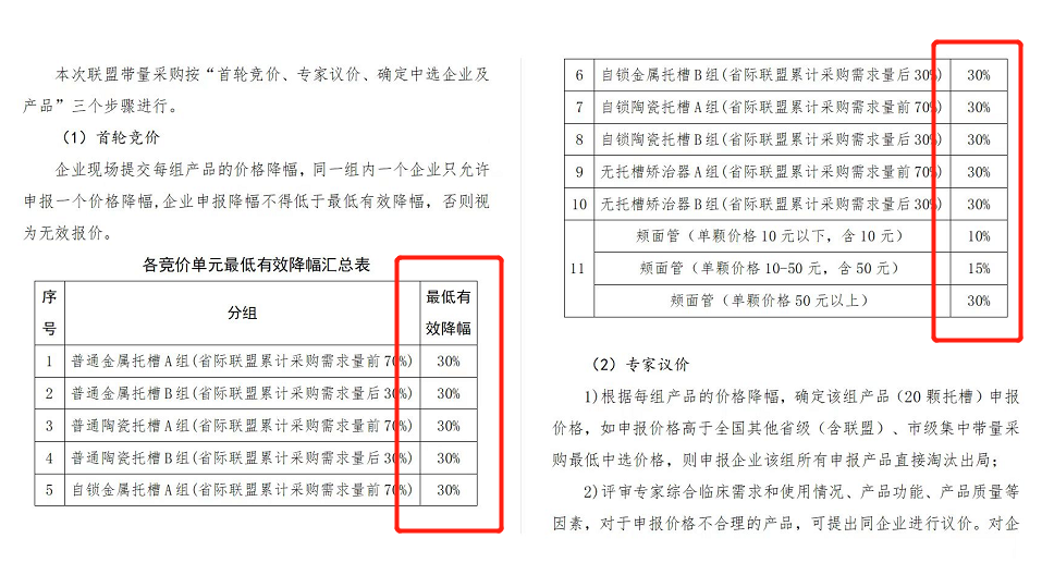 文件顯示,此次集采按照「首輪競價、專家議價、確定中選企業(yè)及產(chǎn)品」進(jìn)行。首輪競價中企業(yè)申報降幅不得低于低有降幅,除去頰面管這類議價產(chǎn)品,托槽、無托槽矯治器的報價將七折起步。