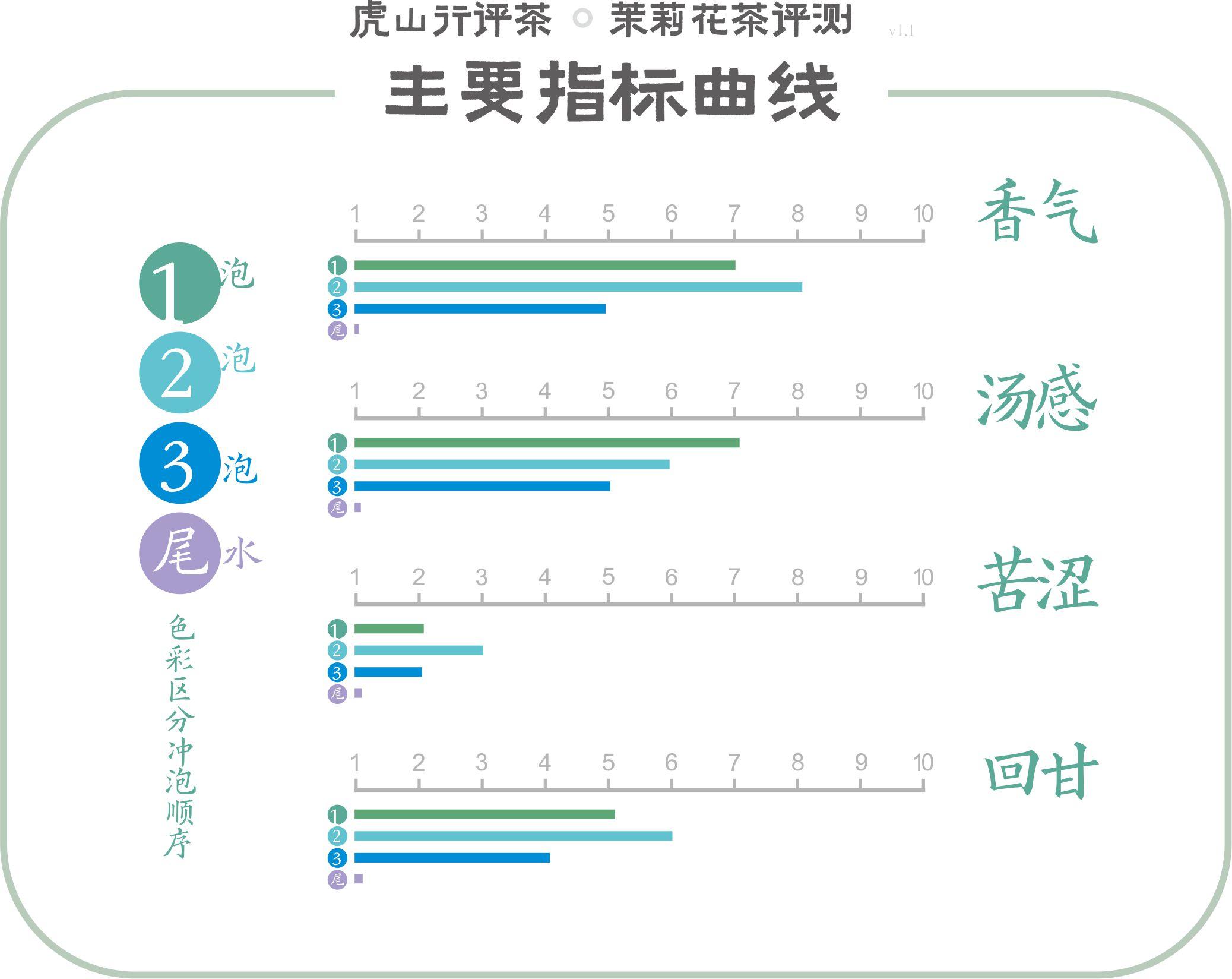 解析:指標圖示可見香氣濃郁程度很不錯,有一定持續(xù)性,后段下降較快。湯感看逐次弱化,厚度表現(xiàn)還不錯,穩(wěn)定性也較好??酀缺容^,澀感一直較顯,這是茶坯品質(zhì)特點造成。再看生津回甘,強度很一般,持續(xù)性以及留存還好。