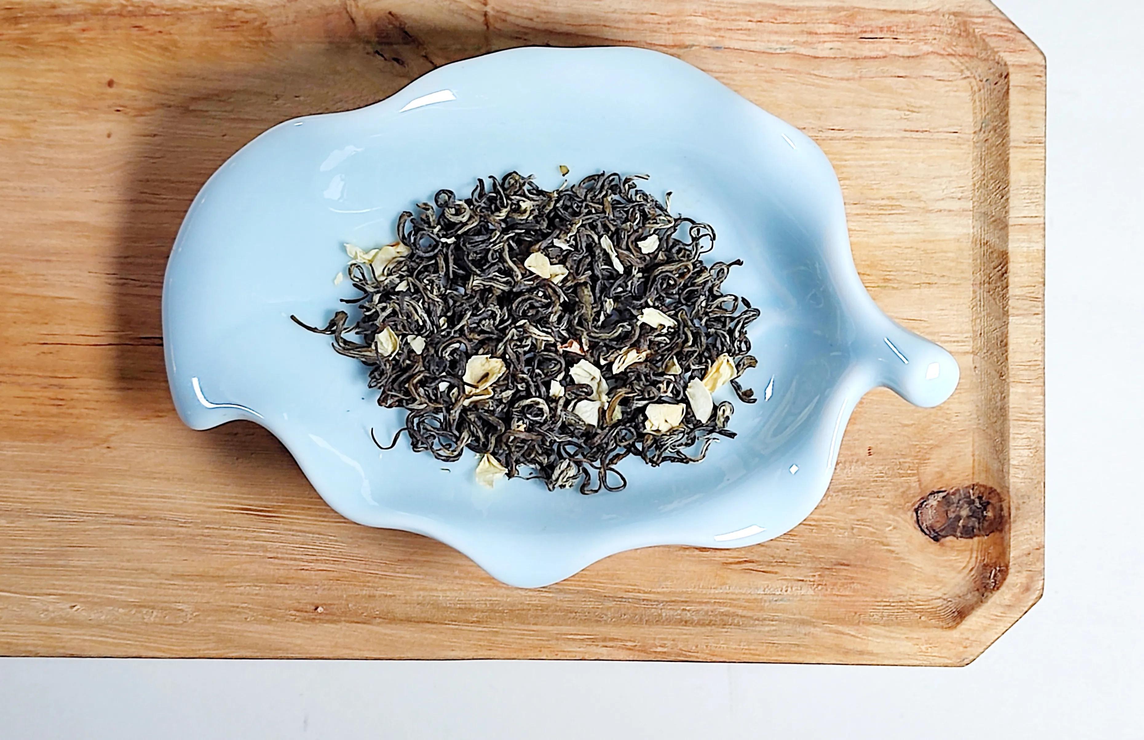 本次評測的為碧潭飄雪特級(品味)茉莉花茶,在碧潭飄雪屬于中檔,價格也不便宜,合斤價為1280元,在茉莉花茶的主銷區(qū)間屬于中高端價位。此款茶采用的是四川的峨眉山毛尖茶與橫縣產(chǎn)的茉莉花,窨制次數(shù)沒有明示(評測假定為六次以上),等級為特級。下面進入評測。