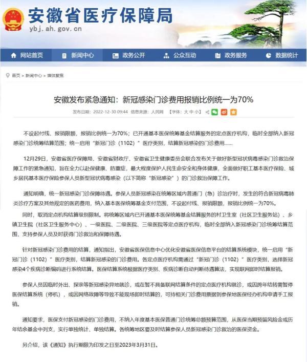 據(jù)安徽省醫(yī)療保障局消息,2022年12月29日,安徽省醫(yī)療保障局、安徽省財政廳、安徽省衛(wèi)生健康委員會聯(lián)合發(fā)布關(guān)于做好新型冠狀病毒感染門診救治保障工作的緊急通知,明確參保人員新冠感染在統(tǒng)籌區(qū)域內(nèi)普通門(急)診調(diào)節(jié)時,發(fā)生的符合新冠病毒肺炎診療方案及其他規(guī)定的醫(yī)藥費用,納入基本醫(yī)保統(tǒng)籌基金支付范圍,不設(shè)起付線、報銷限額,報銷比例統(tǒng)一為70%。