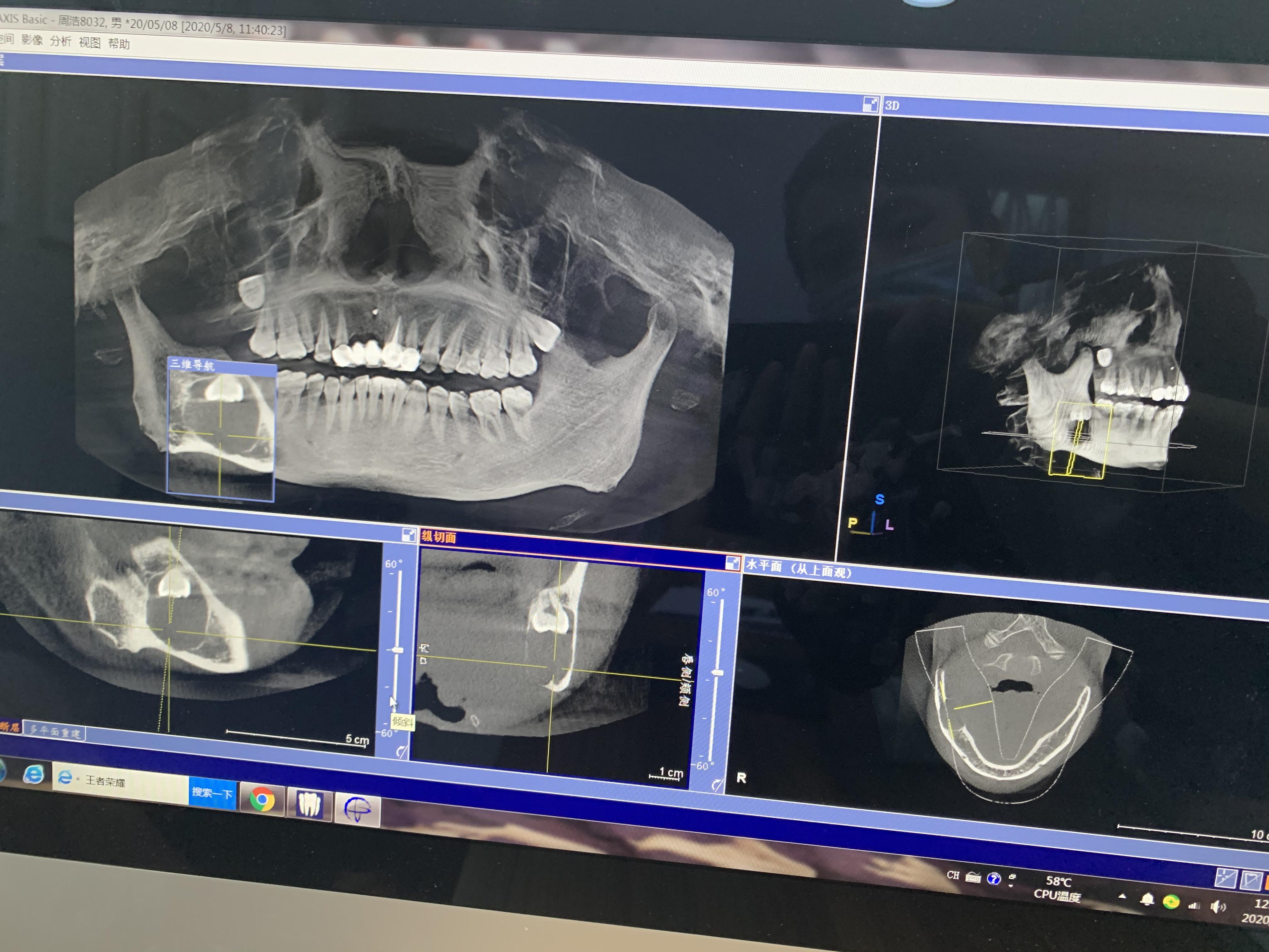 5月7日半夜被疼醒,感覺右側(cè)臉腫起來了,疼的厲害,整個(gè)頭皮都是疼的,我才知道這不是上火,懷疑是智齒,一晚上都沒睡著,第二天一大早,我家附近就有牙博士口腔,到那后馬上拍了一張片子,我心里在想,如果是智齒,那就趕緊拔了吧,太痛苦了,做好了拔牙和吃稀飯的思想準(zhǔn)備,可當(dāng)片子出來后,給我的卻是一個(gè)晴天霹靂。