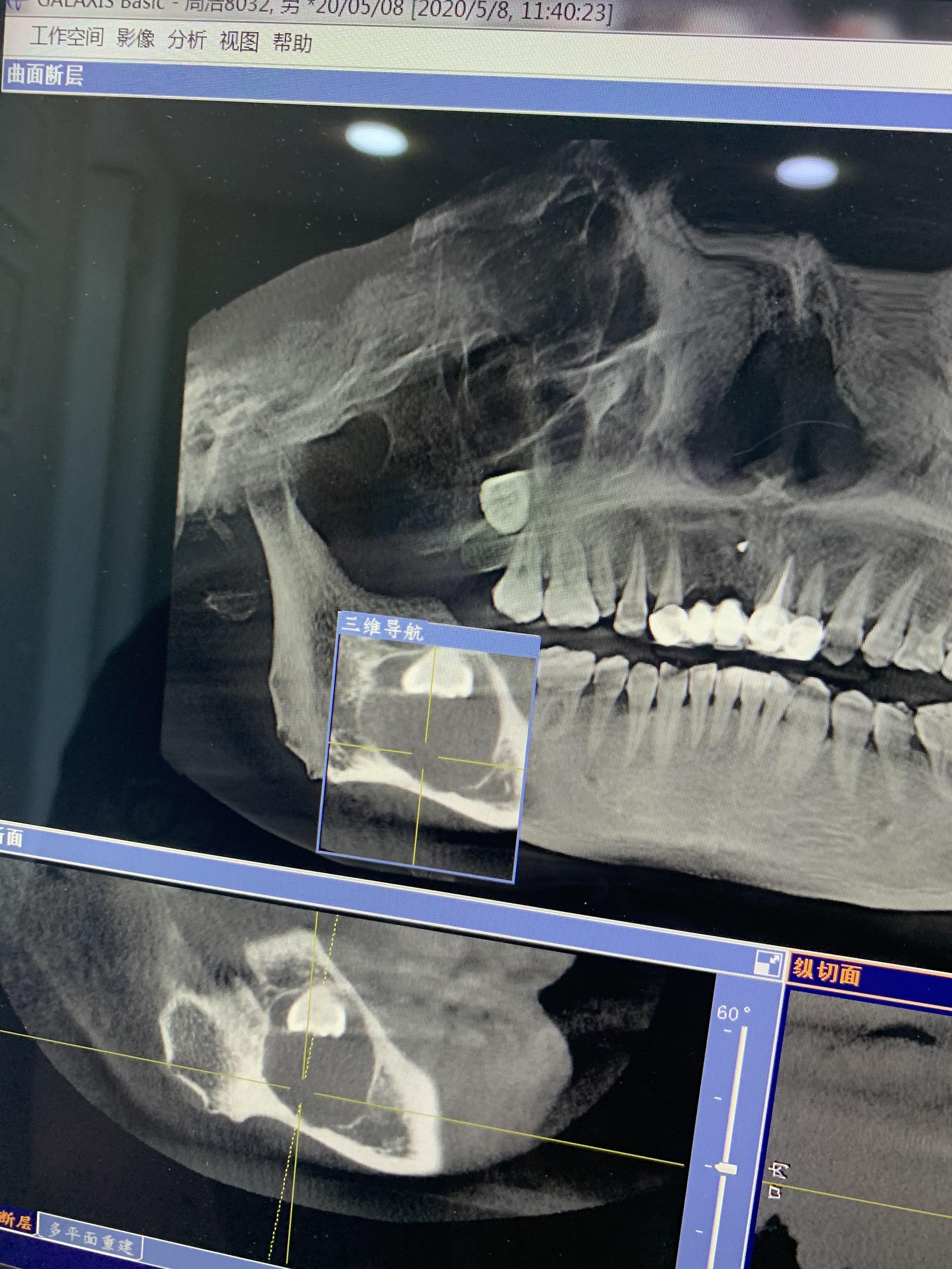 5月8日上午9點(diǎn)半,牙博士醫(yī)生把我叫到房間看片子,打開我的片子,他一句“我的天,這應(yīng)該是囊腫,骨頭都要斷了,天啦骨頭都跟紙一樣薄了,不行,我去找院長(zhǎng)來”,他出去了,我一個(gè)人坐在那楞住了,這不是智齒嗎?什么囊腫?骨頭斷了?我的天,我瞬間感覺我是不是要廢掉了~
