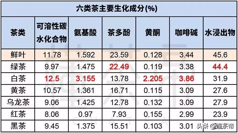 湖南農(nóng)業(yè)大學楊偉麗教授團隊,曾采用相同地點、相同嫩度的鮮葉毛蟹春茶,以駐芽二葉、三葉為主的鮮葉為原料,分別按炒青綠茶、遠安鹿苑(黃茶)、湖南黑茶、白牡丹(白茶)、鐵觀音和功夫紅茶加工方法加工成六大茶類,主要生化成分含量如下。