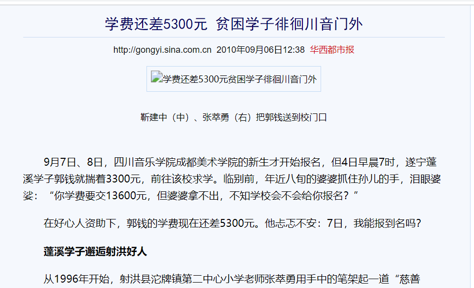 2010年9月6日,華西都市報(bào)報(bào)道了“貧困學(xué)子徘徊川音門外”一事。