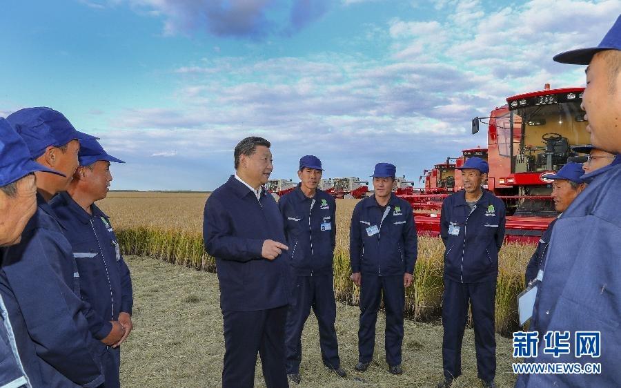 9月25日,在黑龍江農(nóng)墾建三江管理局七星農(nóng)場(chǎng)萬(wàn)畝大地號(hào)與農(nóng)場(chǎng)工人們親切交談。 新華社記者 謝環(huán)馳 攝