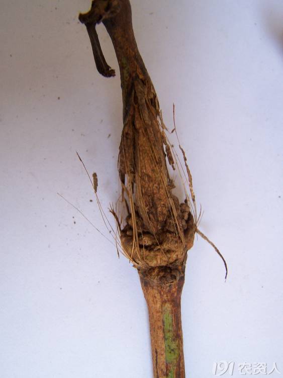 白腐病為害枝條,前期可能形成一些潰瘍性的病斑,隨著病害的發(fā)展,表皮上也會出現(xiàn)白色的小點(diǎn),然后慢慢脫落,掉下去很多病原,一般在土壤中越冬。