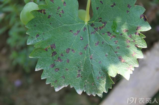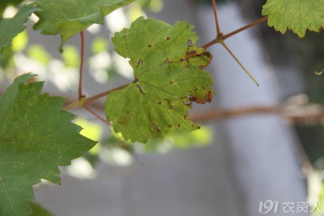 渭南 摩爾多瓦(抗霜霉病品種)發(fā)生黑痘病,葉片出現(xiàn)病斑。
