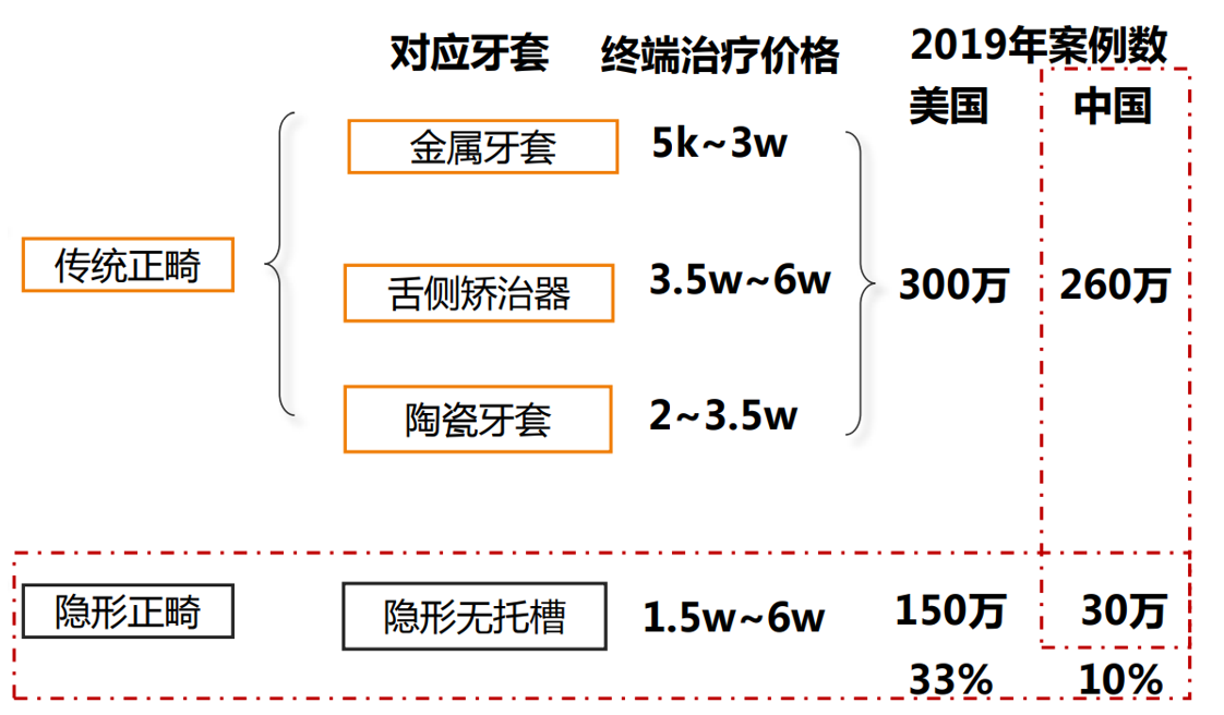 目前,國內(nèi)的隱形正畸滲透率才0.06%,而美國的滲透率為1.38%,就算只能達(dá)到美國的一半,滲透率仍有10倍成長空間。