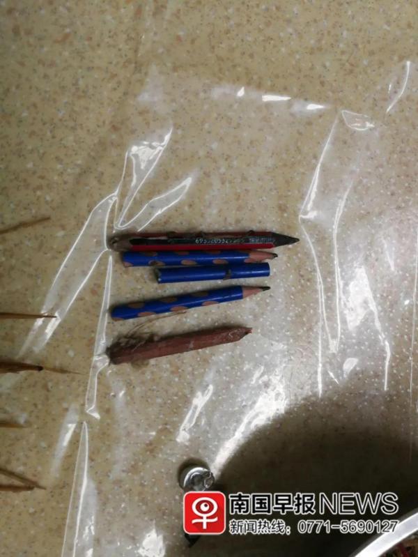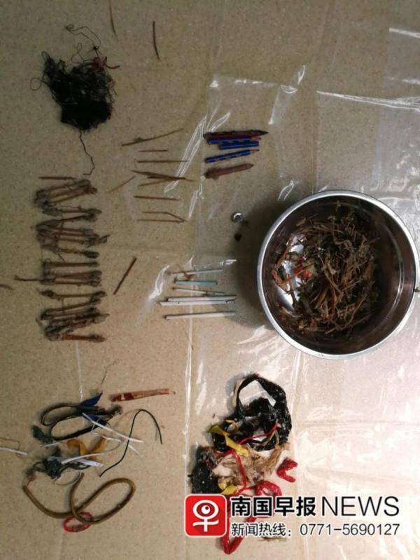 包括牙簽約30余根、棉簽24根、鉛筆5根、吸管6根、安瓿瓶蓋1個、金屬線5根、牙刷柄1根、類似導(dǎo)尿管的管狀物1條、布片1張、數(shù)根包裝帶、根各式線團、根各式塑料袋塑料片、根大小不等竹片樹枝、根頭發(fā)絲等。