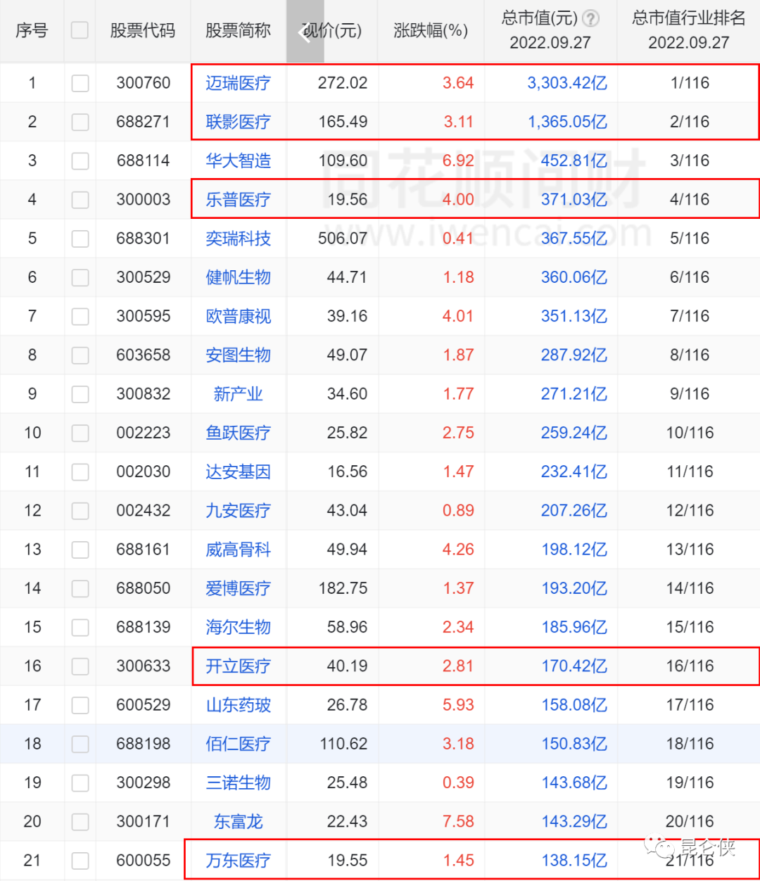 A股目前的醫(yī)療器械上市公司市值排名前20強(qiáng)如下,在聯(lián)影醫(yī)療上市之前,邁瑞是一只市值過千億的公司,目前市值仍然比其它19強(qiáng)公司市值總和還要高,可謂是一覽眾山小,的一哥。