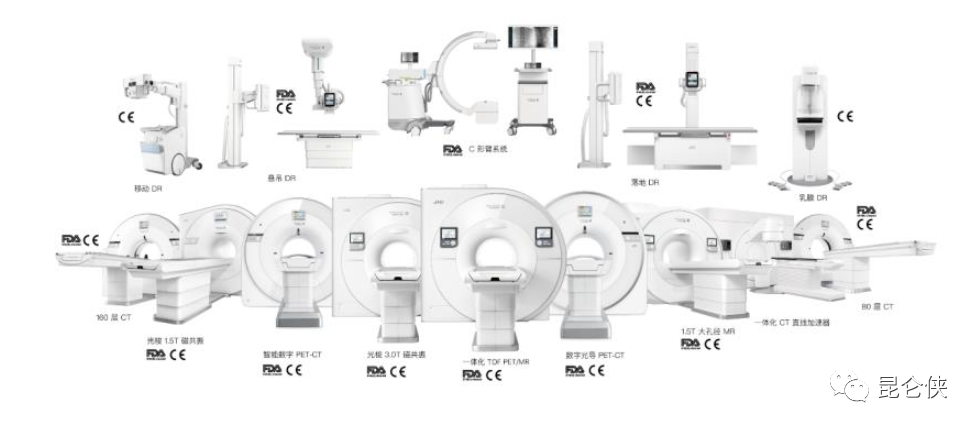 而聯(lián)影醫(yī)療從事的是醫(yī)療器械三大類中的影像設(shè)備這個(gè)領(lǐng)域,主要產(chǎn)品有磁共振成像系統(tǒng)(MR)、X 射線計(jì)算機(jī)斷層掃描系統(tǒng)(CT)、 X 射線成像系統(tǒng)(XR)和分子影像設(shè)備(MI)。上述這些詞匯太過專業(yè),下圖是它們長什么樣(其實(shí)長得也差不多)以及比較通俗一些的解釋。