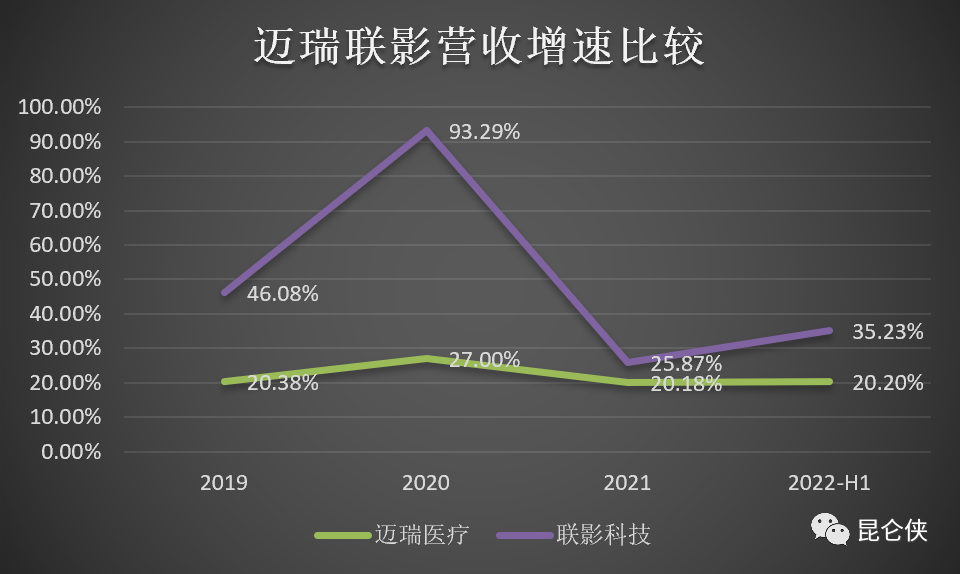 邁瑞公司2022上半年共實(shí)現(xiàn)銷售收入153.6億元,同比+20.2%。而聯(lián)影2022年上半年實(shí)現(xiàn)營收41.7億元,同比增長35.23%。邁瑞的營收規(guī)模大約為聯(lián)影的3倍多一些。