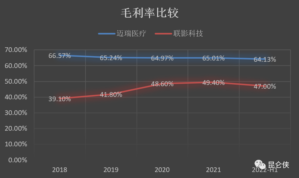 從過去5年來看,邁瑞醫(yī)療的毛利率一直保持在65%的高位,還是很穩(wěn)定的。而聯(lián)影過去3年毛利率有了比較的提升,這在很大程度上和2020年疫情爆發(fā)以來對(duì)CT等影像設(shè)備的高需求有關(guān),相信后續(xù)通過產(chǎn)品結(jié)構(gòu)升級(jí),靠更多的中高端產(chǎn)品還能繼續(xù)提升或者保持目前毛利率。