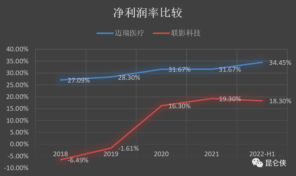 邁瑞公司2022上半年扣非凈利潤52.5億元,同比+25%,過去4年增速也保持在20%以上,略高于營收增速。而聯(lián)影在扣非凈利潤方面則要遜色很多,2020年收益于疫情爆發(fā),才實(shí)現(xiàn)首度盈利,盈利持續(xù)性還有待繼續(xù)觀察。