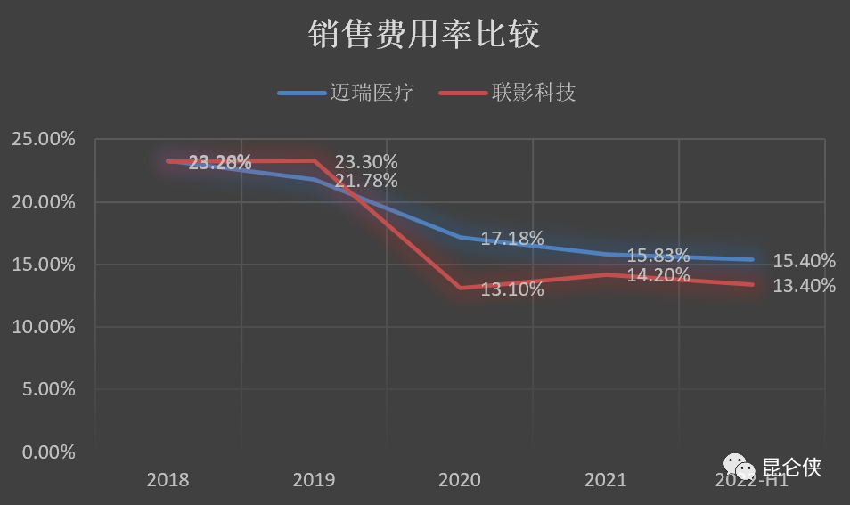 在時(shí)間更早的2015~2017年,邁瑞的銷售費(fèi)用占營收比重高達(dá)27%、26.5%、24.4%,銷售費(fèi)用是同期研發(fā)費(fèi)用的兩倍以上。這些年邁瑞已經(jīng)從重銷售的公司往銷售和研發(fā)并重的公司轉(zhuǎn)型。
