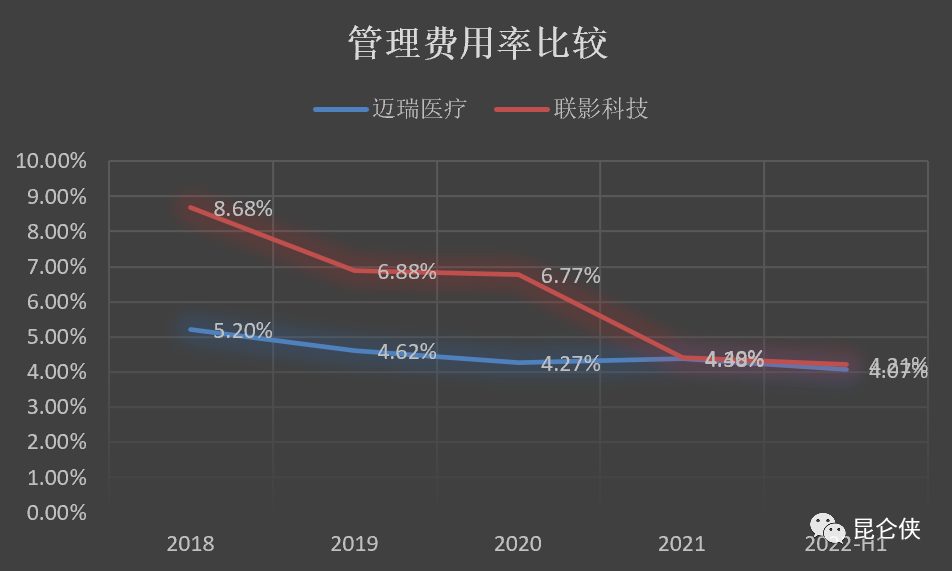 管理費(fèi)方面,邁瑞一直控制的不錯(cuò),這和邁瑞多年來一直奉行的低成本戰(zhàn)略息息相關(guān)(老板勤儉節(jié)約,和春秋航空的王振華有的一拼)。而聯(lián)影過去一度管理費(fèi)較高,近這兩年持續(xù)下降,目前和邁瑞都處于4%左右的較低狀態(tài)。