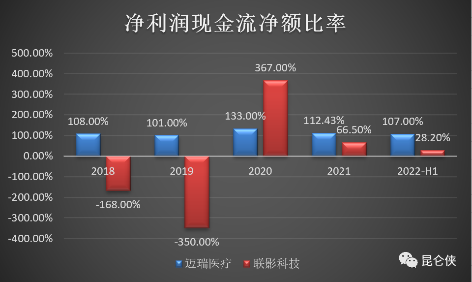 通過下圖我們可以看到邁瑞過去5年凈利潤現(xiàn)金比率均大于1,說明凈利潤的含金量很高。而聯(lián)影的盈利含金量就差了很多,特別要注意去年和今年下降的很厲害,這時(shí)我們一定要留心。