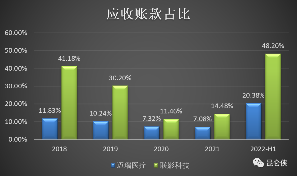 通過查閱財(cái)報(bào),我發(fā)現(xiàn)問題主要出在應(yīng)收賬款方面,除了2020和2021年外,聯(lián)影公司應(yīng)收賬款占營業(yè)收入的比例都高,但2022年上半年其應(yīng)收賬款大幅上升到20.14億元,同比增長151%,遠(yuǎn)超過營收增速,值得警惕。