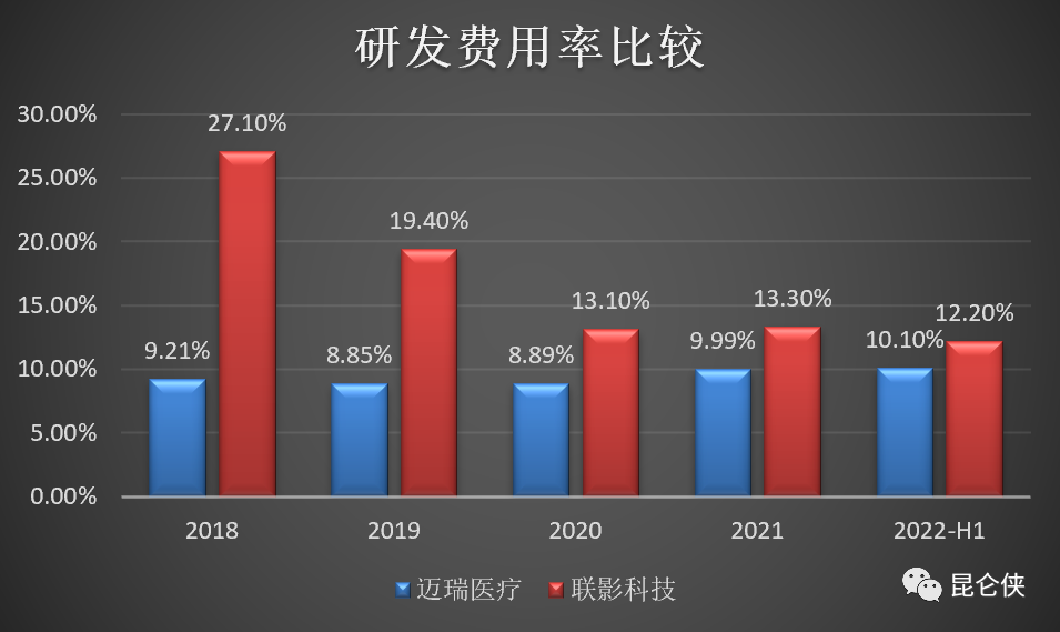 錢要花在刀刃上,與在費(fèi)用成本上面的“摳摳索索”不同的是邁瑞多年來一直在研發(fā)費(fèi)用上面又舍得花錢,每年將10%的營業(yè)額投入研發(fā),而聯(lián)影的研發(fā)投入比例還要更高點(diǎn),作為一家未上市公司更加難難可貴。