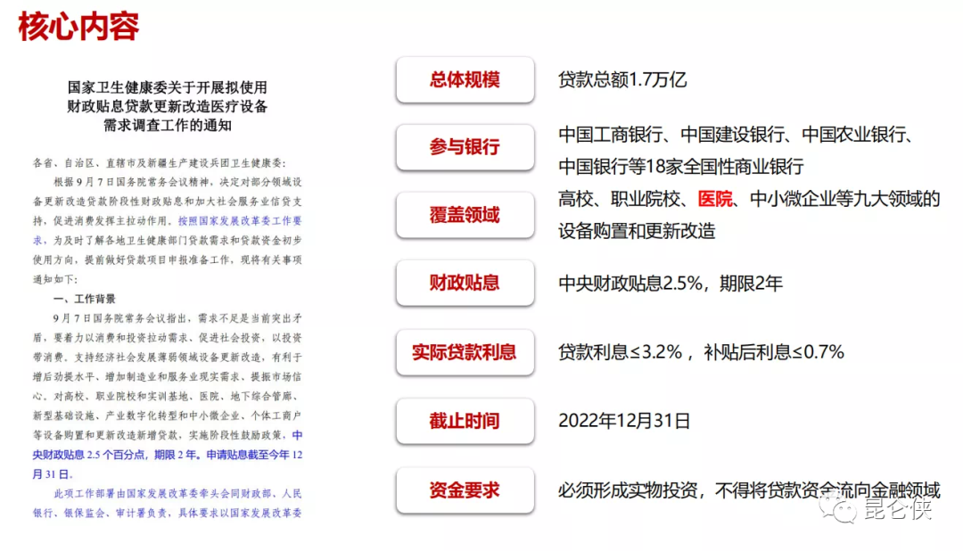 1、再度加碼醫(yī)療新基建,國產(chǎn)替代有望加速9月13日,國常會(huì)確定專項(xiàng)再與財(cái)政貼息配套支持部分領(lǐng)域設(shè)備更新改造。為響應(yīng)國常會(huì)的決定,近日衛(wèi)健委發(fā)布通知,擬使用1.7萬億財(cái)政貼息更新改造醫(yī)療設(shè)備,再度加碼新基建,并擬于近期發(fā)布配套政策。
