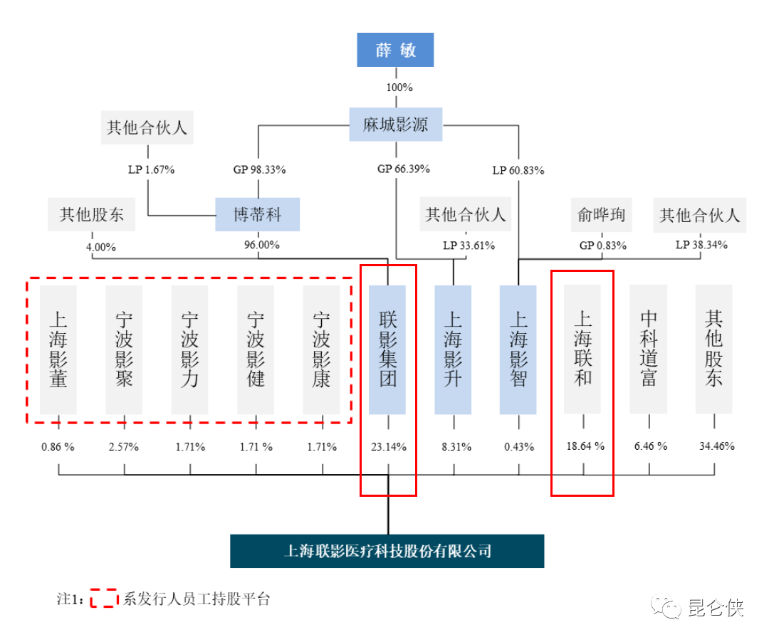 聯(lián)影目前第一大股東為聯(lián)影集團(tuán)持股23.14%,薛敏通過麻城影源間接持股公司23%的股權(quán),此外還通過另外幾家公司持有部分股權(quán),合計(jì)持有31.88%的股份,是公司的實(shí)際控制人。