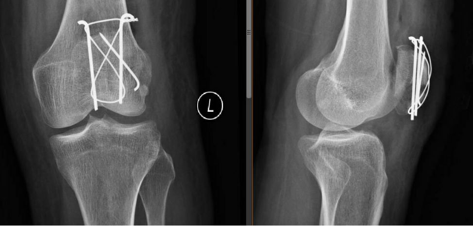 術(shù)后第二天復(fù)查左髕骨X線提示:左髕骨骨折術(shù)后改變,可見(jiàn)金屬內(nèi)固定器影,斷端對(duì)位對(duì)線佳,骨小梁尚規(guī)則,左膝關(guān)節(jié)在位,關(guān)節(jié)間隙尚可。